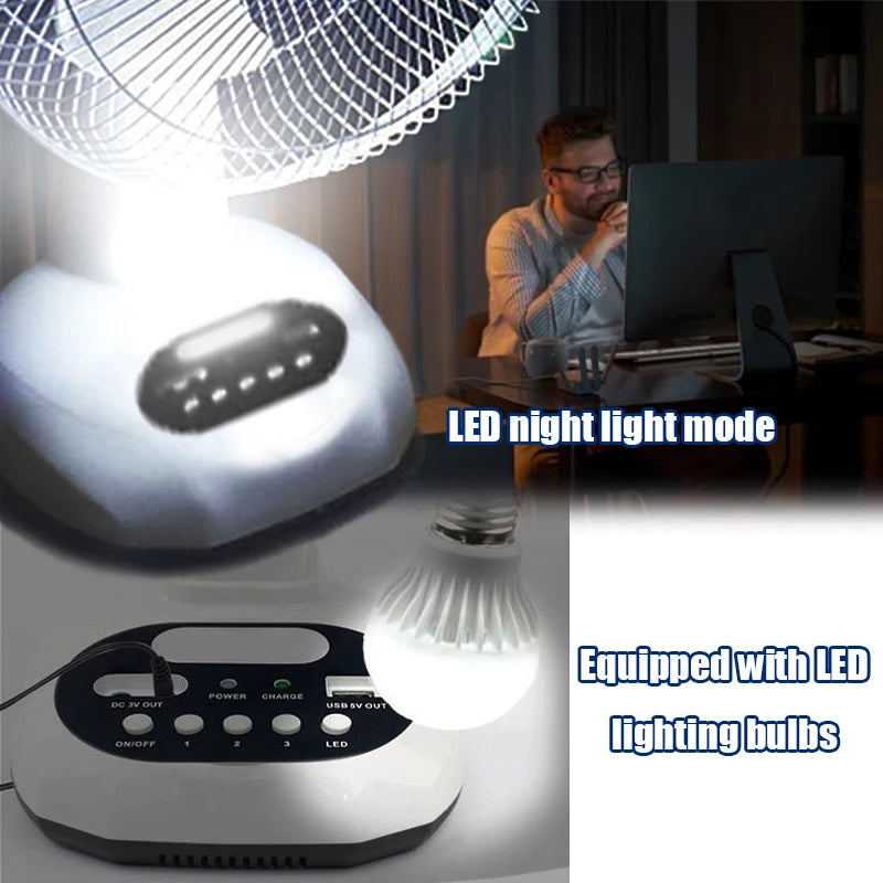Two 12-inch portable solar fans, shared 14400mAh battery, 10W solar input, USB charging port, three fan speeds, built-in LED lighting with an integrated bulb, durable plastic housing, UL-certified design, table-top ready for both home and travel use.